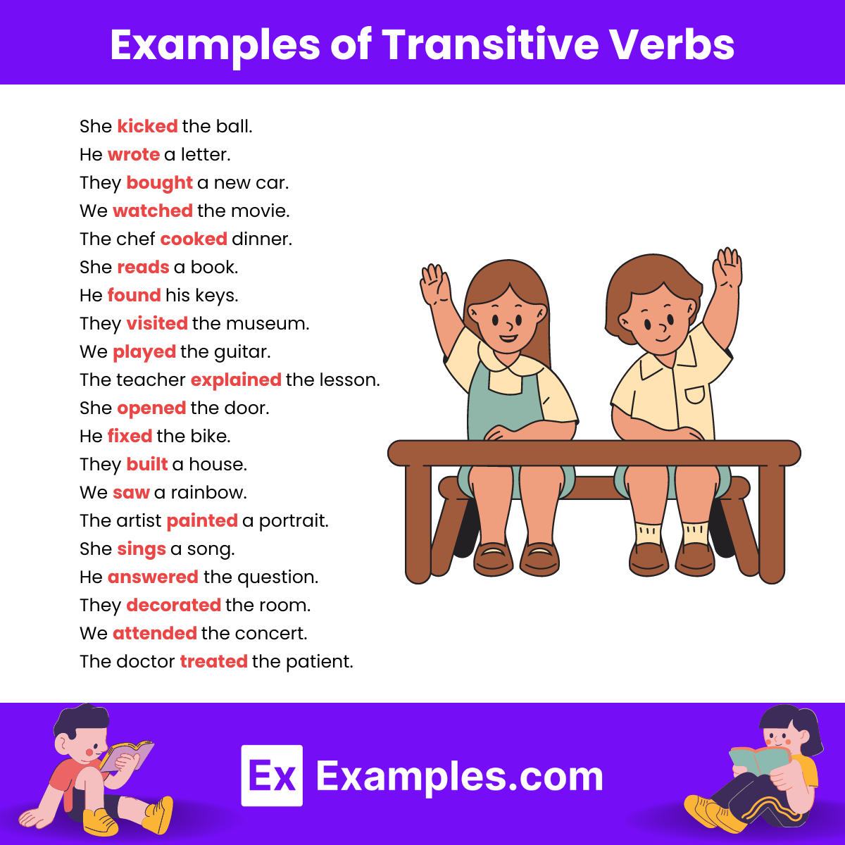 Transitive verbs are verbs that require a direct object to complete their meaning. They are action verbs that transfer their action to a receiver. In other words, transitive verbs have both a subject performing the action and a direct object receiving the action. Here, we will explore 10 examples of transitive verbs.