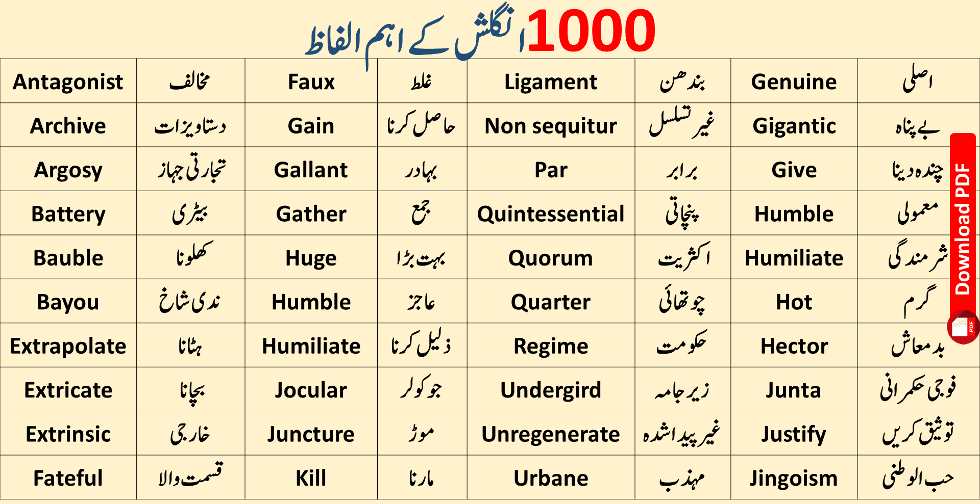 Download and Print 100 daily use english words with meaning Listed below