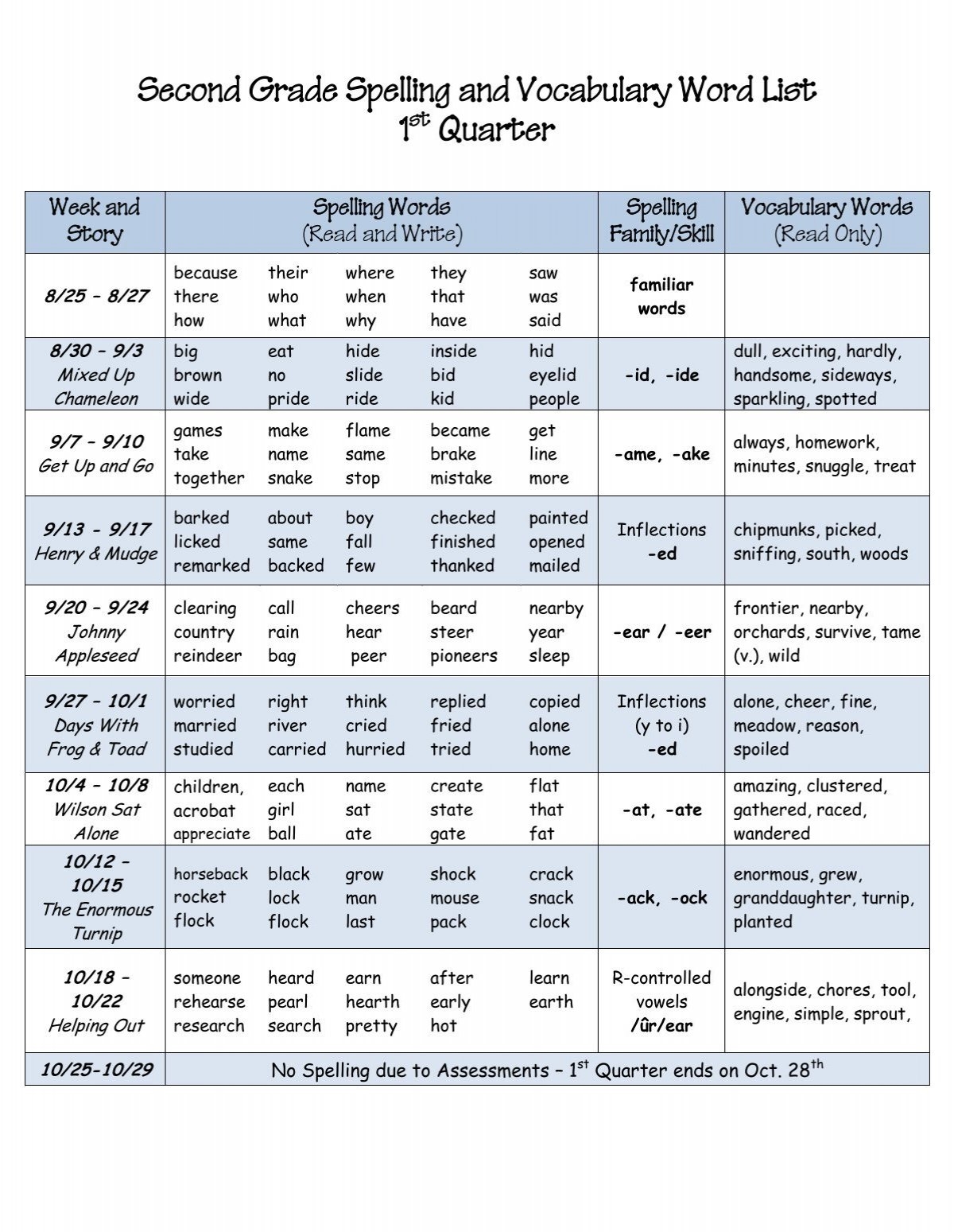 1st Grade Spelling Words Free Printable 36 Week List