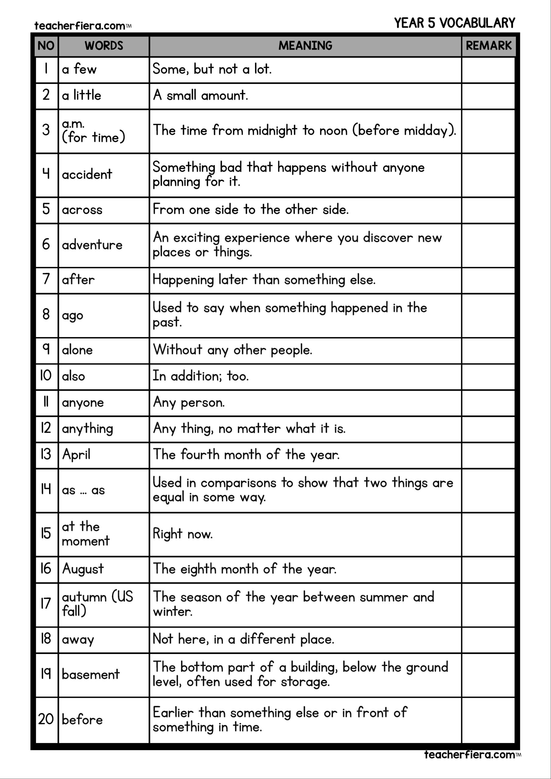 YEAR 5 VOCABULARY WORDS AND MEANING Teacherfiera