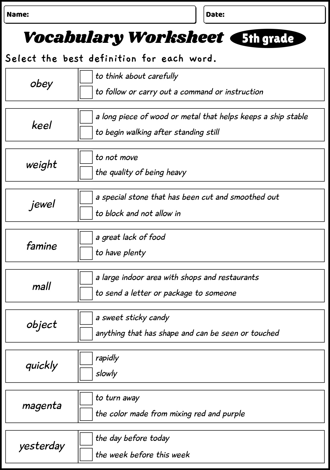 5th grade vocabulary free printable