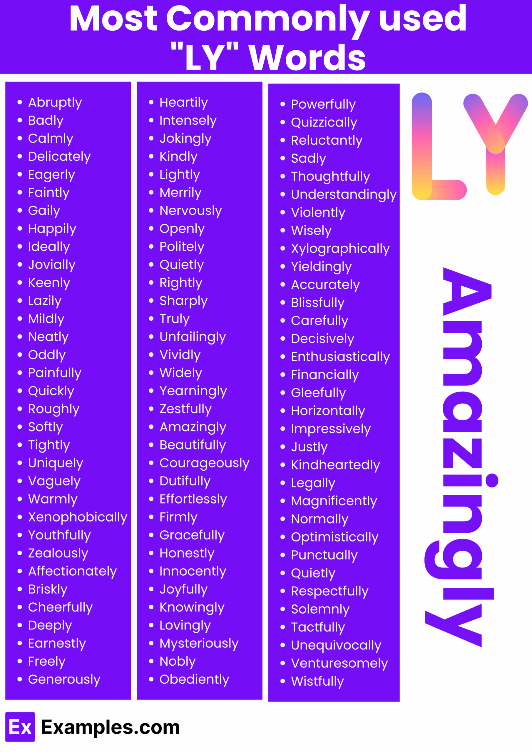 - Adverbs: quickly, softly, carefully, brightly, happily