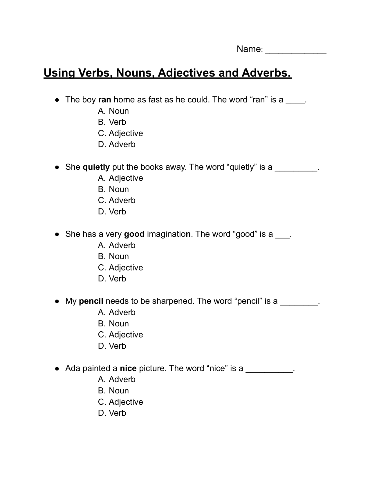 It is important to use adverbs and verb nouns correctly in sentences to convey your message clearly and effectively. To practice using adverbs and verb nouns, complete the following worksheet:
