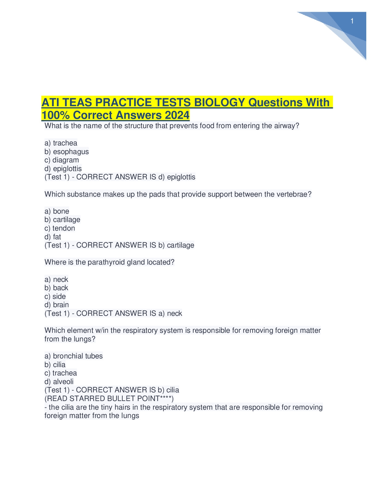 ATI TEAS PRACTICE TESTS BIOLOGY Questions With 100 Correct