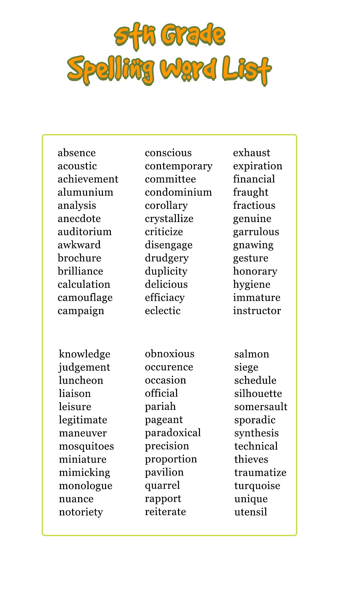 Download and Print comprehensive 5th grade vocabulary list Listed below