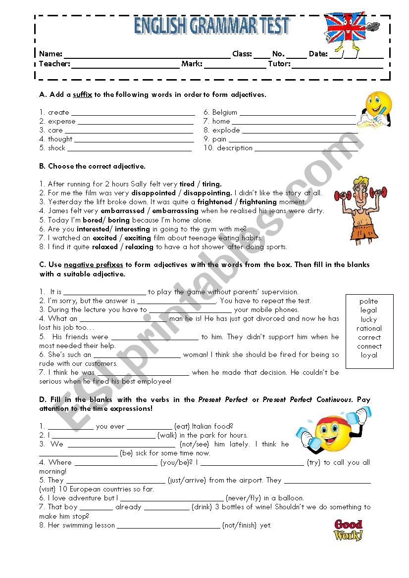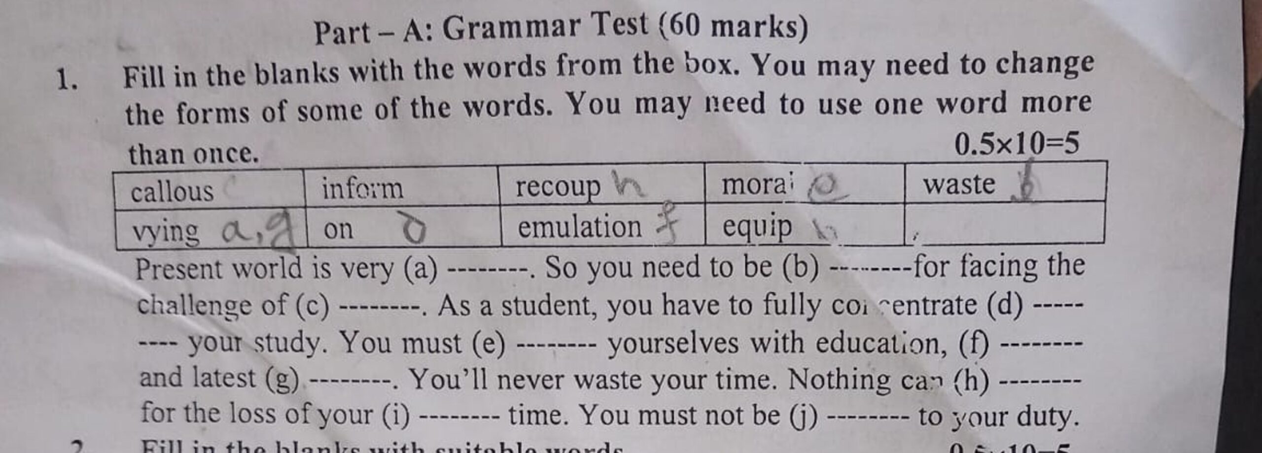 Part A Grammar Test 60 Marks Fill In The Blanks With The Words From
