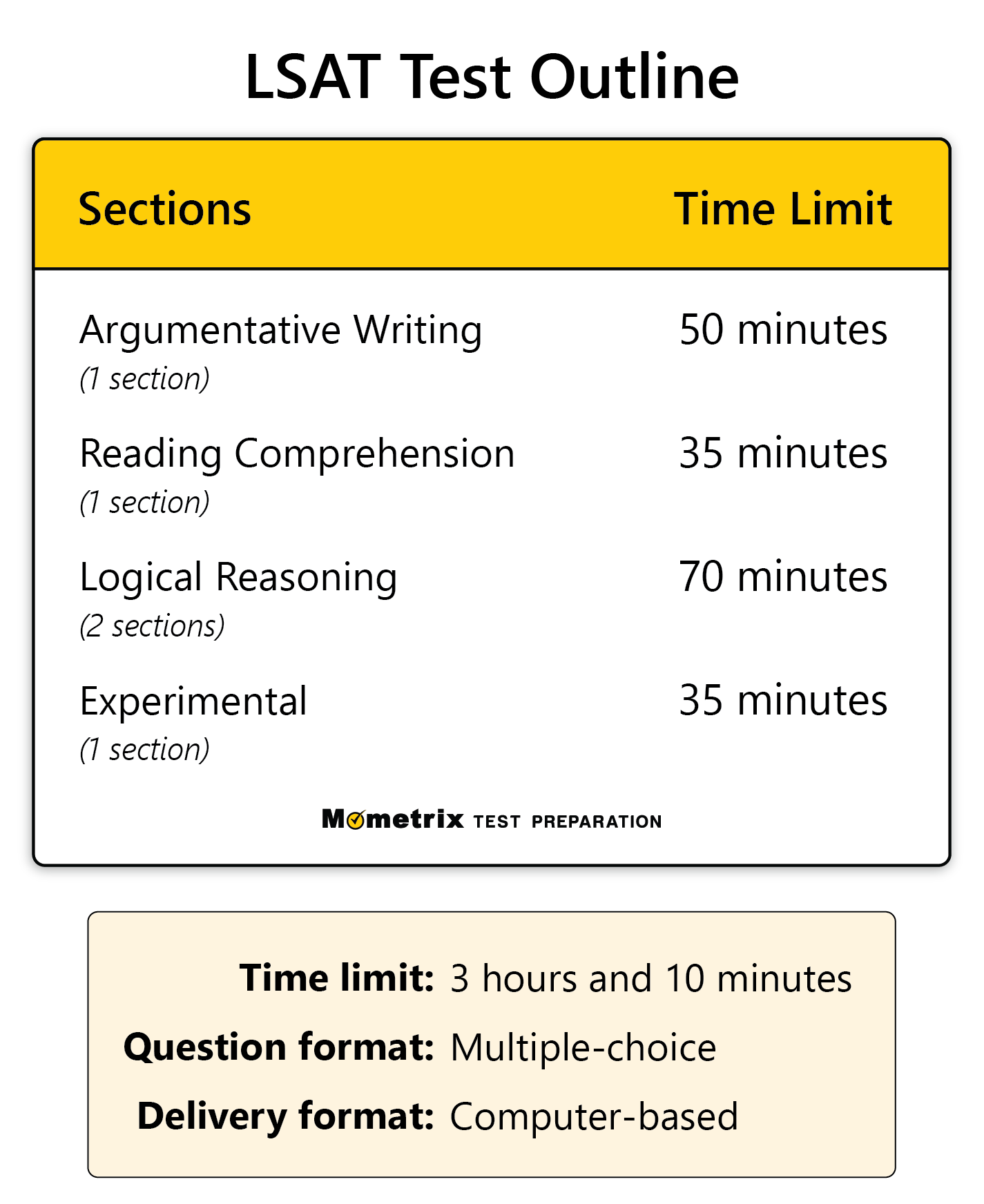 The LSAT consists of five multiple-choice sections, each containing approximately 25-28 questions. These sections include one Reading Comprehension section, one Analytical Reasoning section, and two Logical Reasoning sections. Additionally, there is an unscored experimental section that is used for research purposes by the Law School Admission Council (LSAC). This section is similar in format to the scored sections but does not contribute to your overall LSAT score. In total, there are around 100-105 questions on the LSAT.