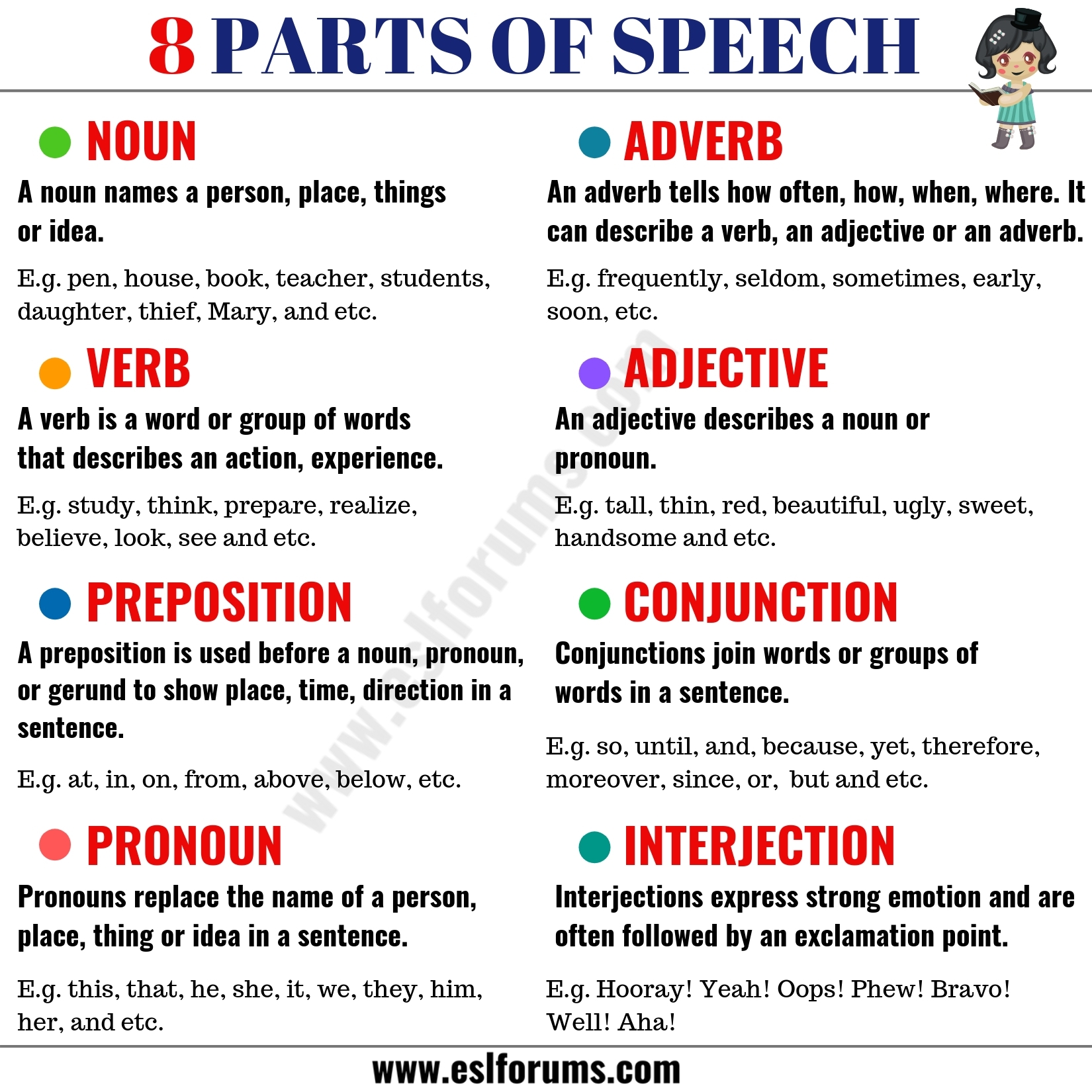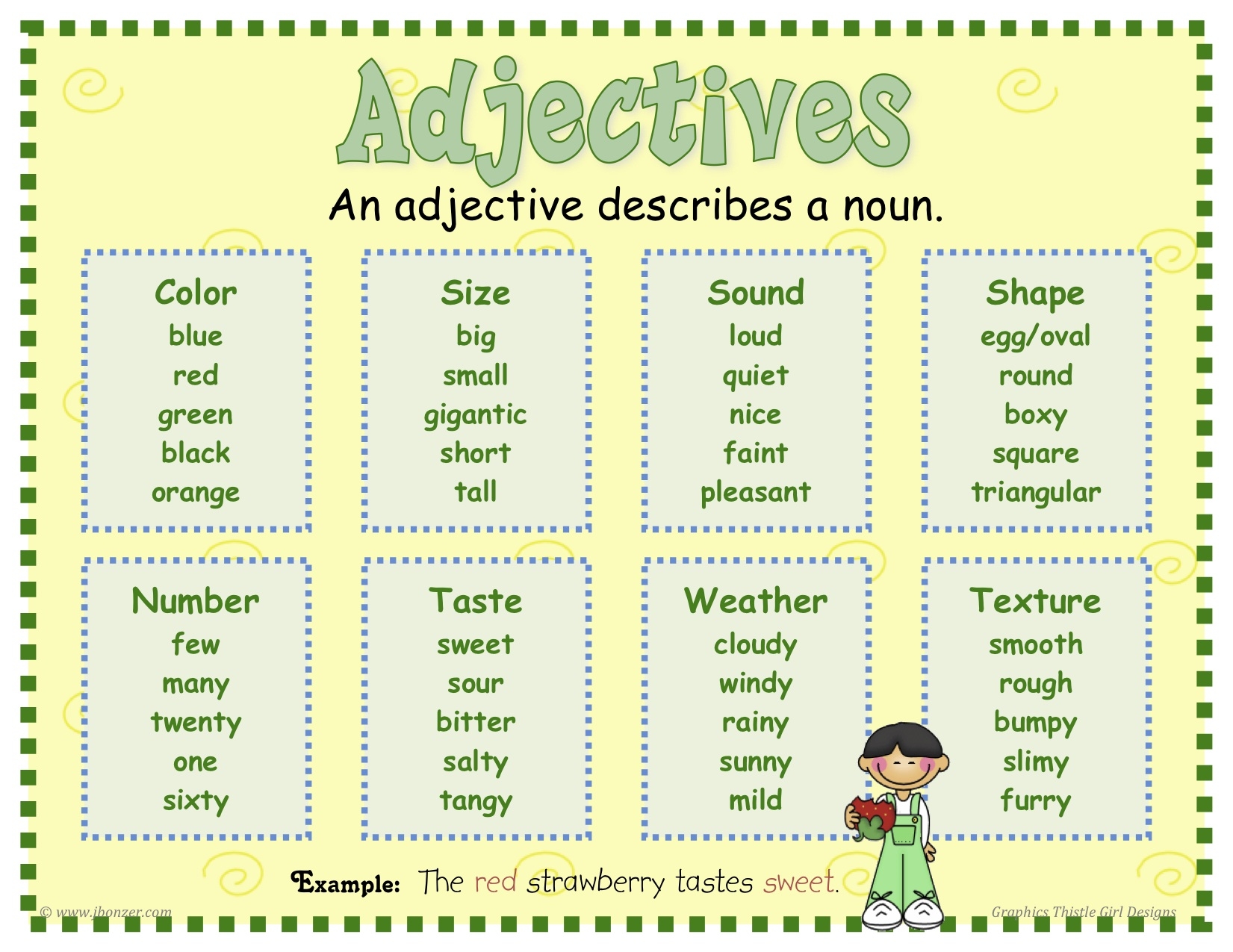 Adjectives: Adjectives are words that describe or modify nouns. They provide additional information about the noun, such as its size, color, shape, or quality. Adjectives can be used to compare different nouns (comparative and superlative forms) or to specify a particular noun (demonstrative adjectives).