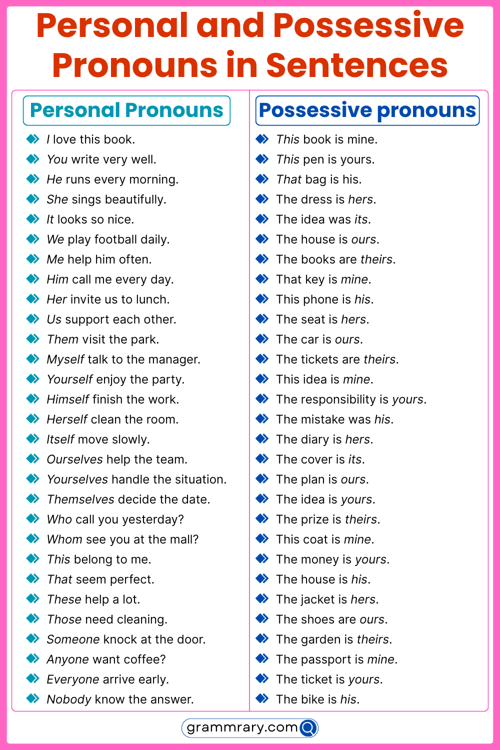 Personal Pronouns And Possessive Pronouns With Examples Grammrary