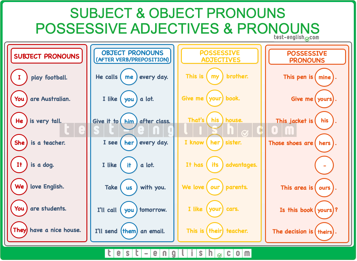 Subject And Object Pronouns Possessive Pronouns And Adjectives Test English