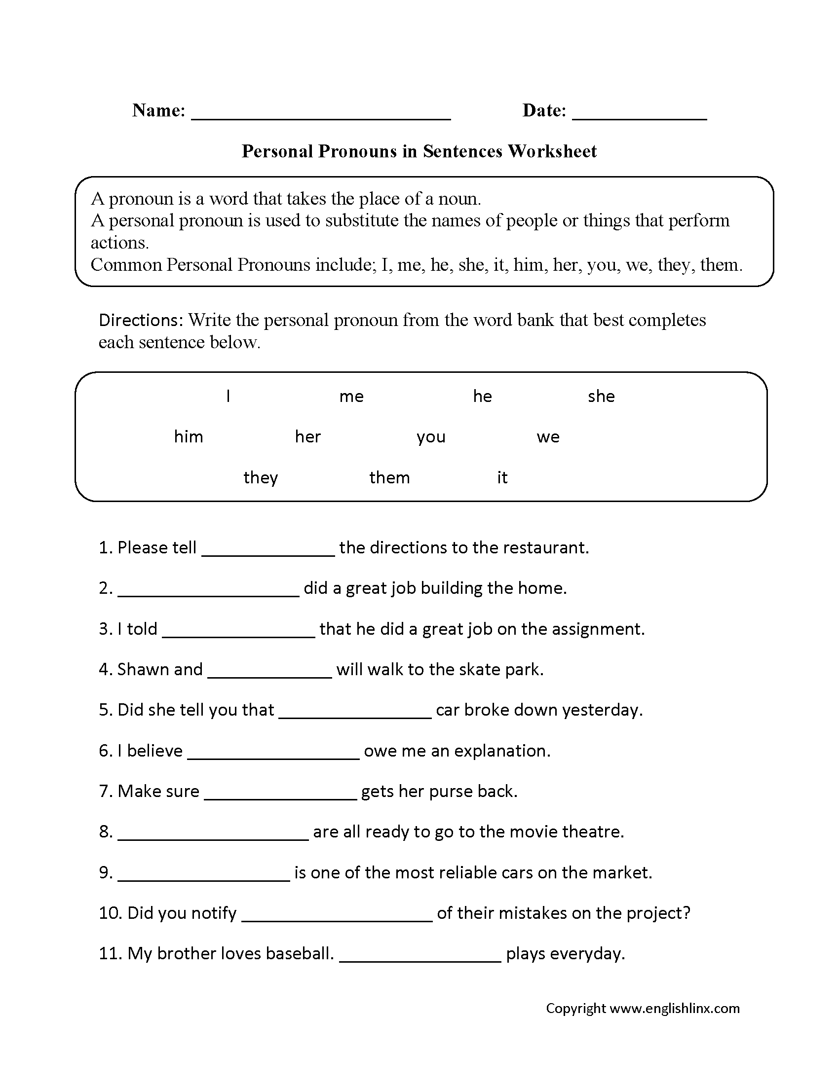 One common type of exercise on a personal nouns worksheet is to fill in the blank with the correct personal noun. For example, students may be given a sentence like “_____ went to the store” and are asked to choose the appropriate personal noun to complete the sentence. This type of exercise helps students practice identifying and using personal nouns in context.
