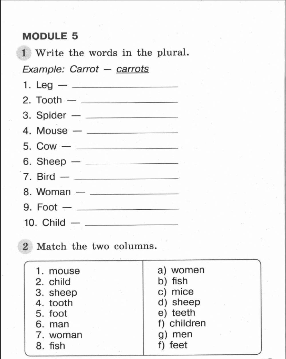 One type of worksheet for Grade 5 students may involve providing a list of singular nouns and asking students to write the plural form of each noun. This helps students practice changing nouns from singular to plural and understanding the rules that apply.