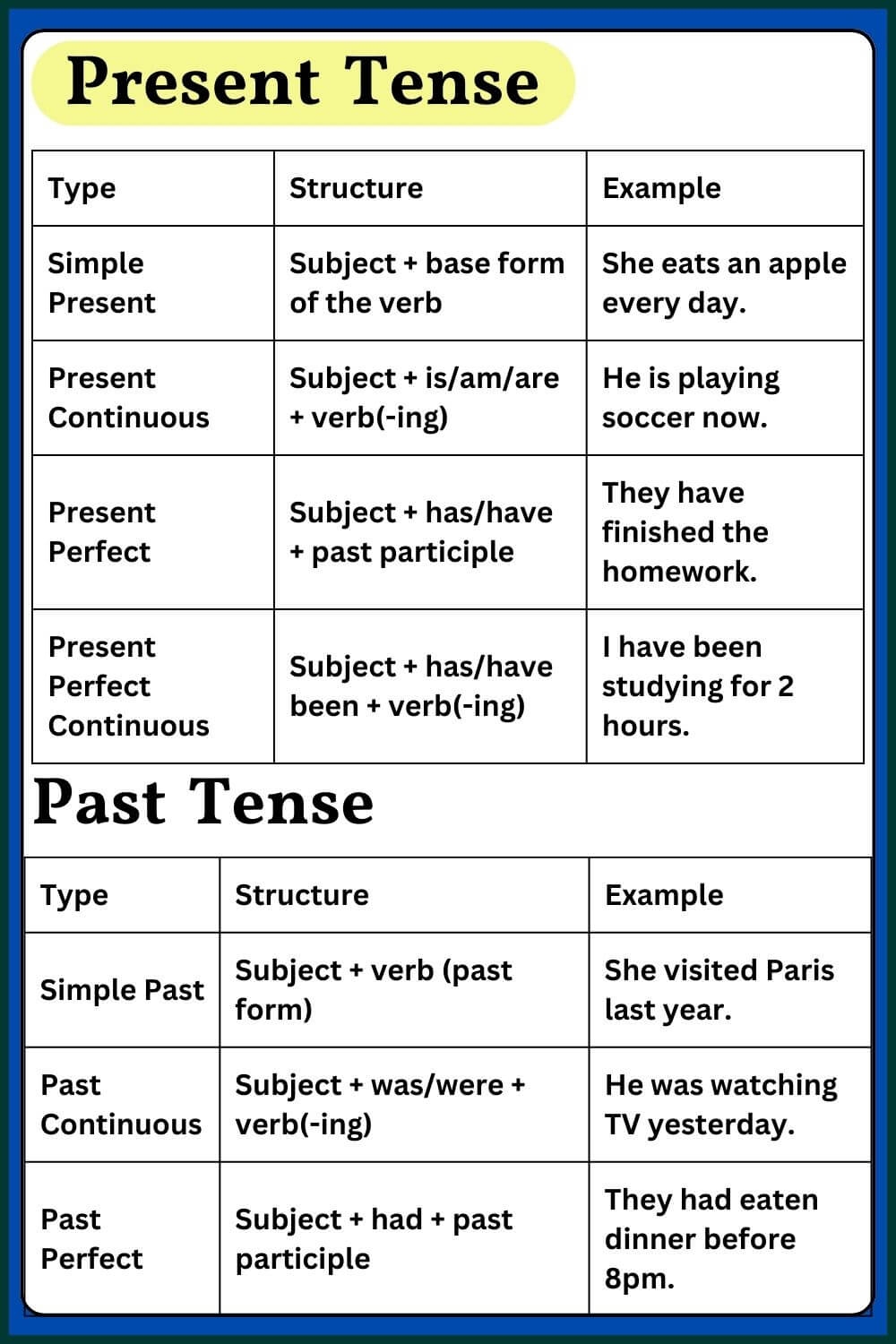 In conclusion, mastering the present and past tense in English is key to effective communication. By referring to charts like the one above and practicing with various verb forms, you can enhance your language skills and express yourself more accurately in both spoken and written English.