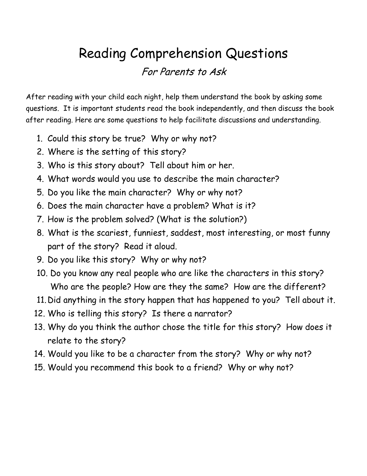 Reading Comprehension Questions For Parents