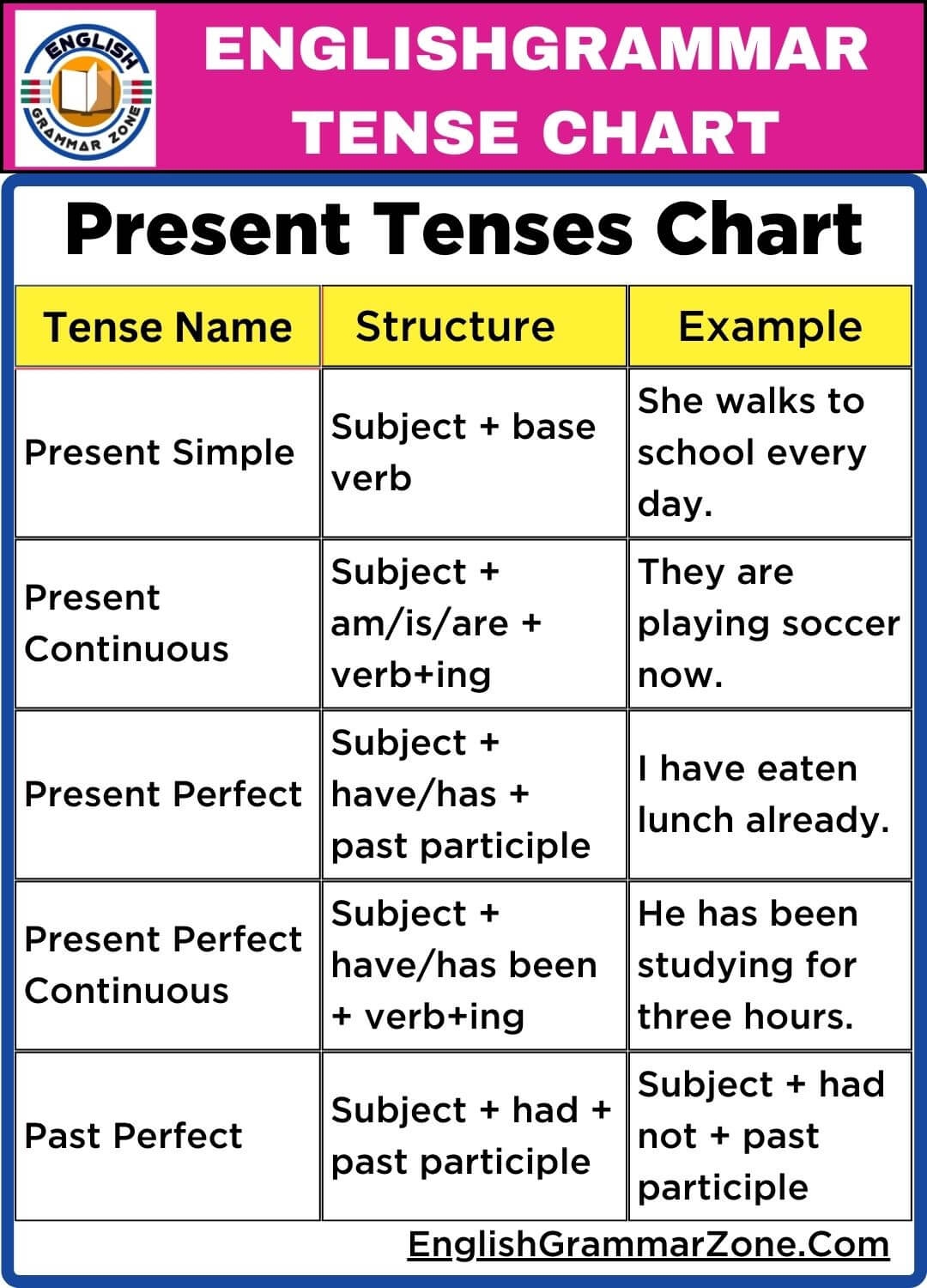 There are three main types of tenses in English: Past, Present, and Future. Each type is further divided into different forms to indicate the specific time frame of an action or event. Here are examples of each type of tense: