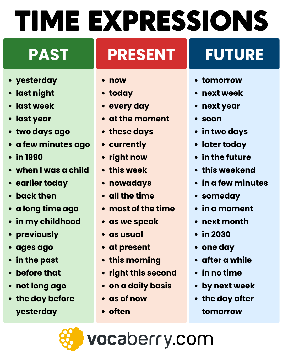 It is important to note that each tense can be further modified with auxiliary verbs, modal verbs, or time expressions to convey more specific information about the timing of an action. Practice using different tenses in sentences to become more comfortable with their usage.