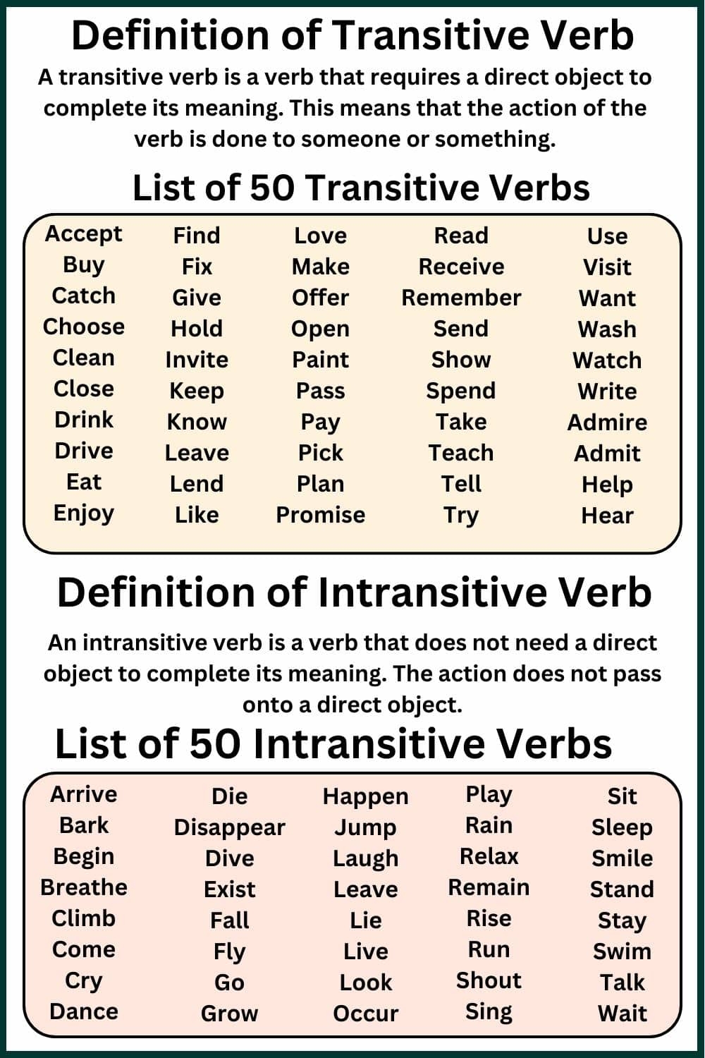 Transitive Verbs: Transitive verbs require a direct object to complete their meaning. For example, in the sentence “She ate an apple,” the verb “ate” is transitive because it requires the direct object “an apple” to make sense.