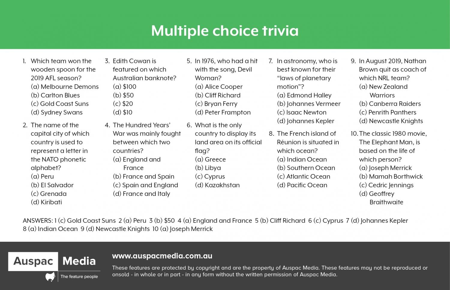 Trivia questions are a great way to challenge your memory and learn new facts. They can cover a wide range of topics, from history and geography to pop culture and sports. By answering multiple choice questions, you can test your knowledge and see how much you really know about the world around you.