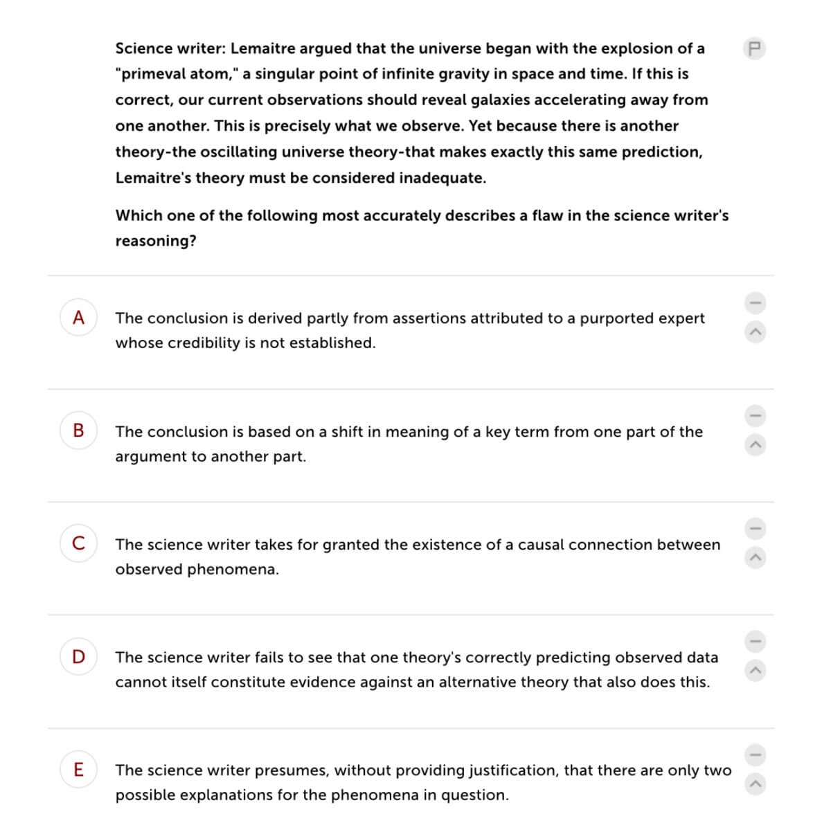 3. Flaw Questions: Flaw questions ask you to identify errors in reasoning within the argument. You must pinpoint the specific flaw or logical fallacy present in the argument and choose the answer choice that accurately describes it.