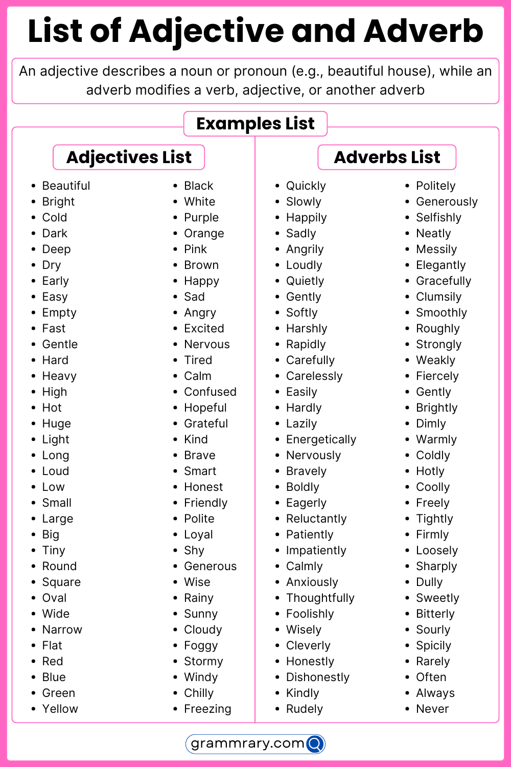 List of Verbs, Nouns, Adjectives, and Adverbs: