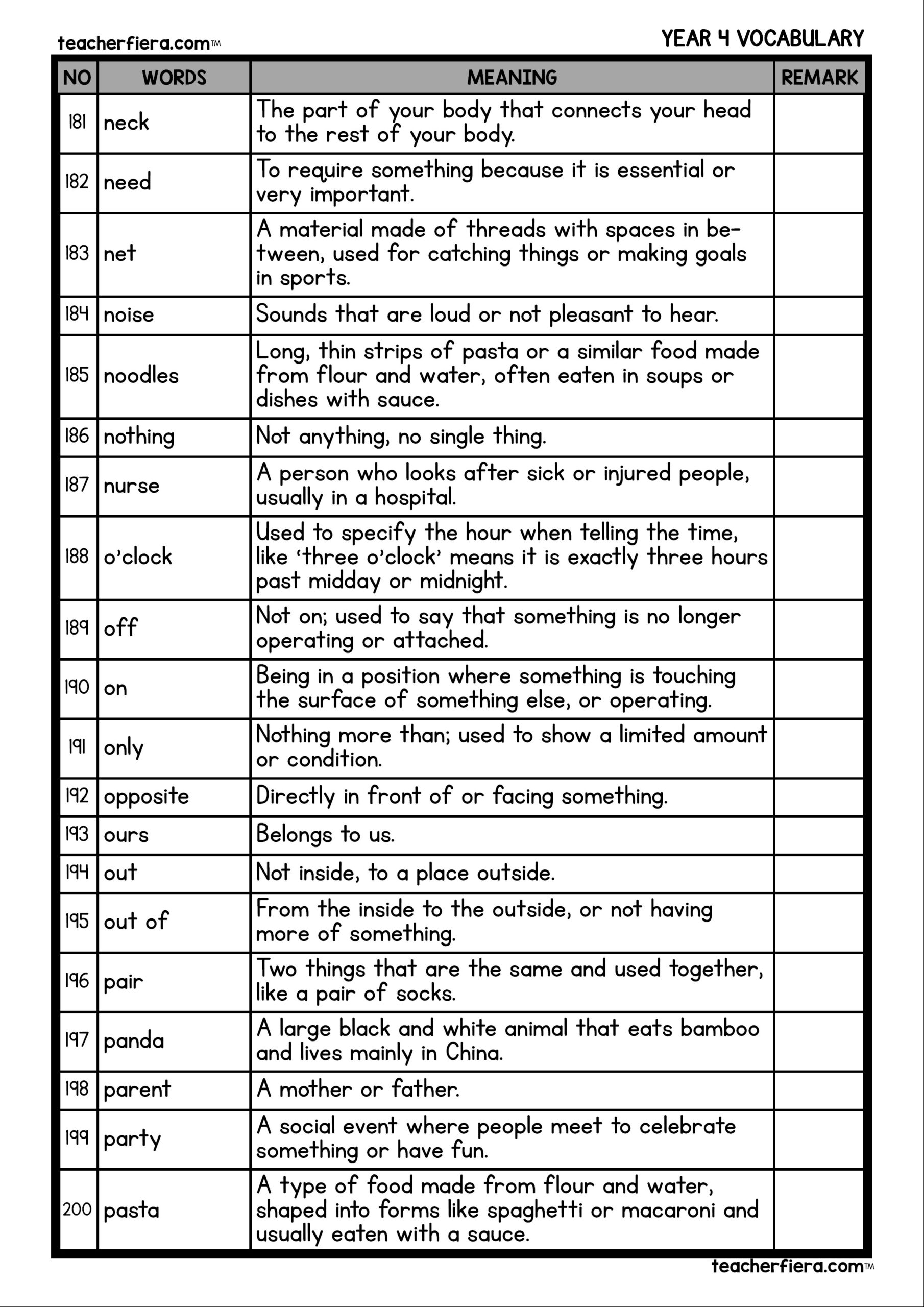 YEAR 4 VOCABULARY WORDS AND MEANING Teacherfiera