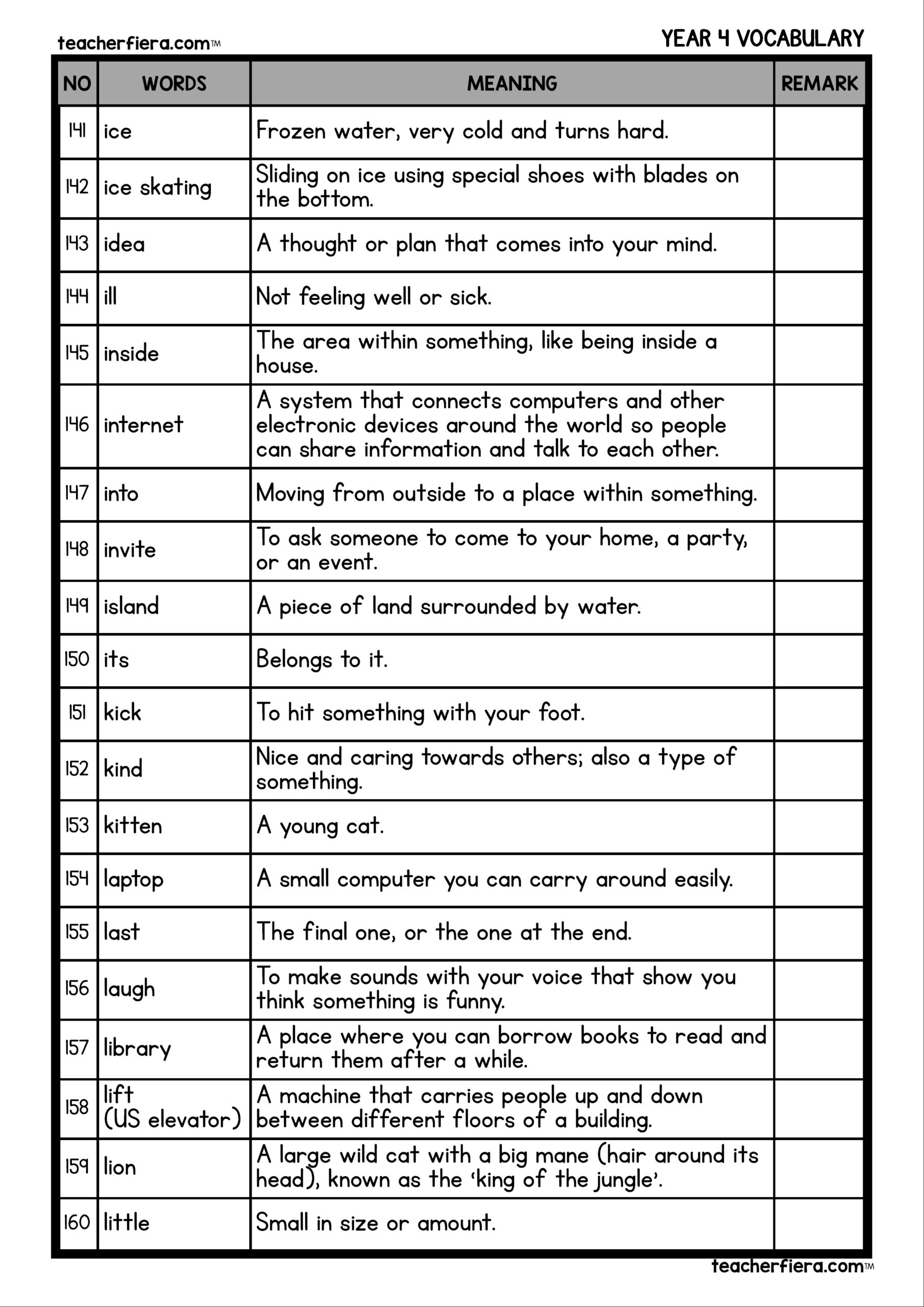 YEAR 4 VOCABULARY WORDS AND MEANING Teacherfiera