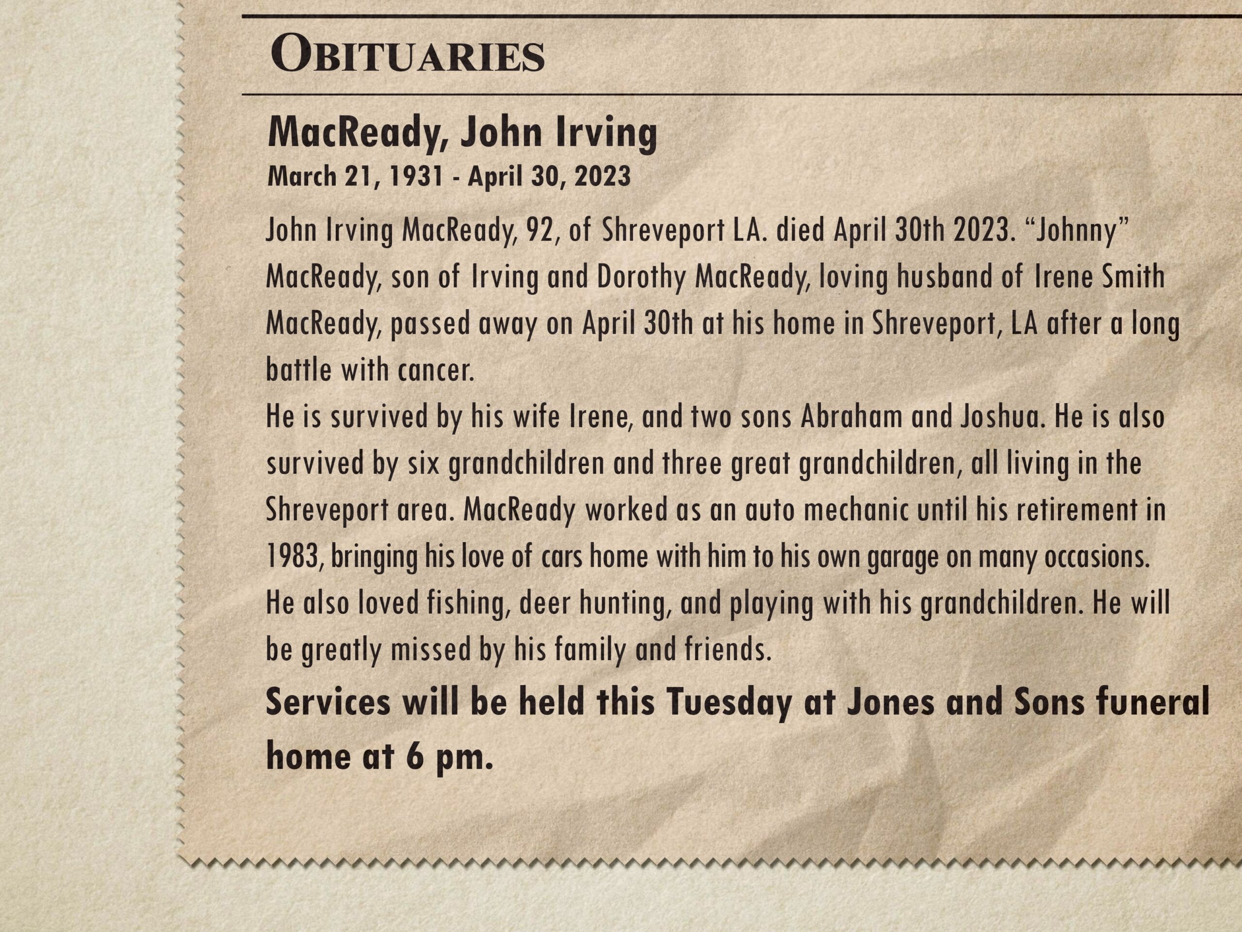 Introduction: Begin by stating your full name, age, and place of residence at the time of your passing. You can also mention your family members or loved ones who survive you.